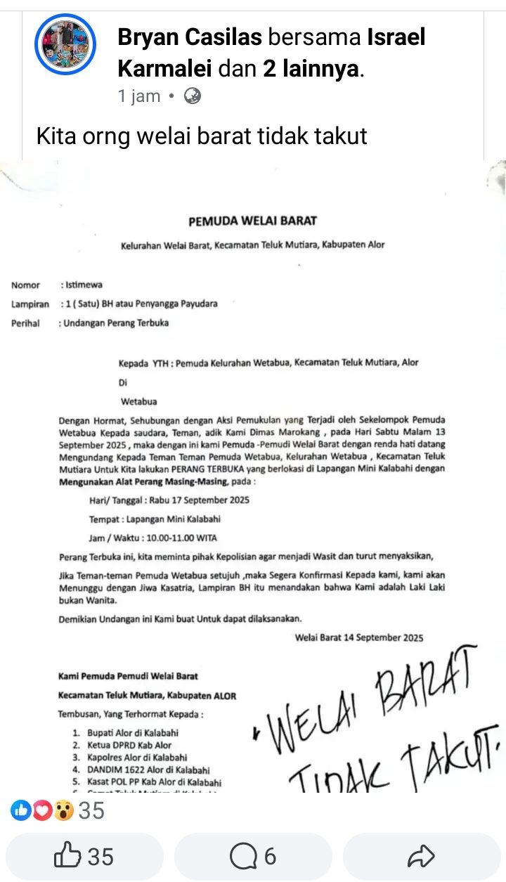 Sebuah surat undangan perang terbuka antarkelompok pemuda kini viral di media sosial. Surat tersebut diposting oleh akun Facebook bernama Bryan Casilas pada Minggu sore (14/09/2025). Dalam postingannya, tercantum undangan dari Pemuda Welai Barat, Kecamatan Teluk Mutiara, Kabupaten Alor, kepada Pemuda Kelurahan Wetabua di kecamatan yang sama.
